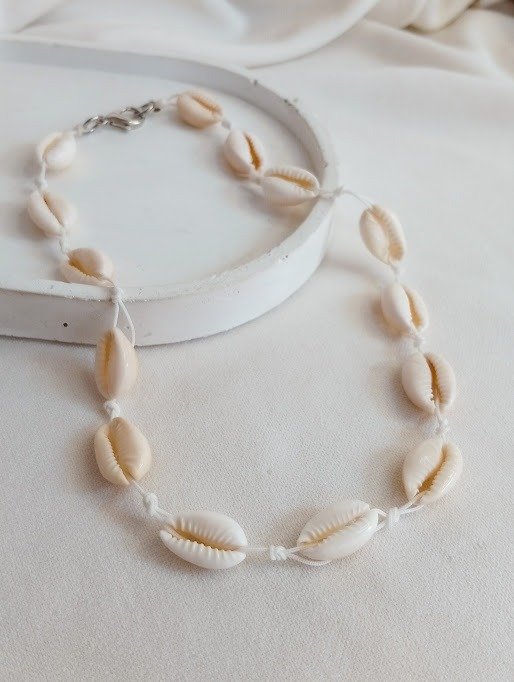 Gargantilla de hilo chino y caracoles con terminaciones de acero.