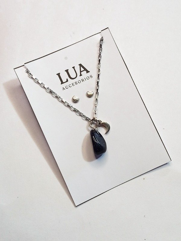 Collar con piedra aventurina+ aros lunitas de acero blanco.